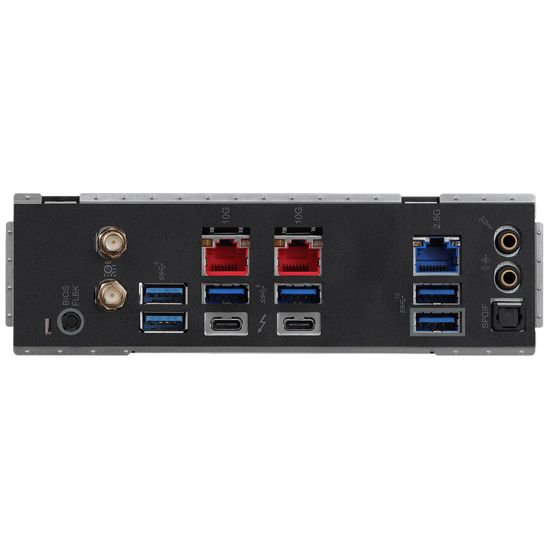 | 拡張スロット | PCI Express 5.0(x16):4 スロット(PCIE1/PCIE3 at x16 | PCIE2/PCIE5 at x8 | プロセッサー) PCI Express 5.0(x16):1 スロット(PCIE4 at x4 | チップセット) ※ 各種ソケット・スロット及び諸条件により、動作速度の低下や排他仕様となる場合があります。 ※ PCI Express スロット形状と動作速度が異なる場合があります。 |