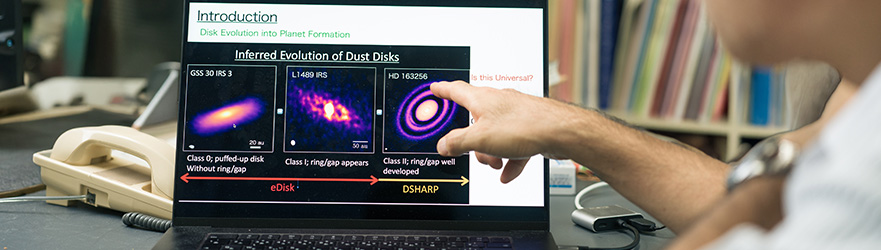なかでも私たちの研究グループが取り組んでいるのは、宇宙で星や惑星がどうやって生まれているかの解明。それが叶えば、太陽系がつくられた経緯や、地球の生物にまつわる多くの謎を解く手掛かりになります。手法としては、宇宙にある分子雲(星が生まれる現場)や星の周りの円盤(惑星が生まれる現場)から放出される電波の観測と解析の繰り返し。膨大な観測データの質、精度を吟味して解析へ。天体観測と言えば、夜空に輝く星々を眺めるロマンチックなイメージですが、研究で私たちが実際に見ているのは計算機の画面ばかり(笑)。地道な作業をコツコツと積み重ねる大変さはありますが、解析が進み、画像として現れたときの高揚感でそれらは帳消しになりますよ。